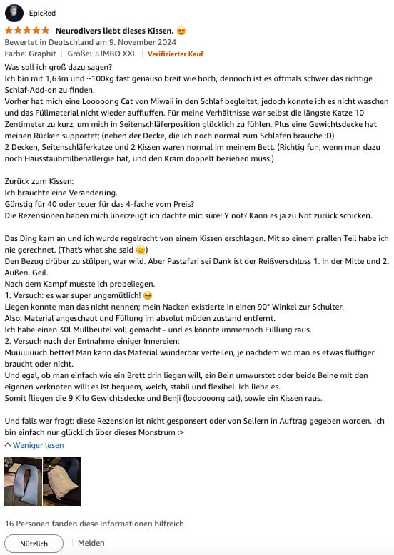 Insbesondere für diejenigen, die auch ein passendes Kopfkissen suchen, da ihr aktuelles in der Seitenlage versagt.